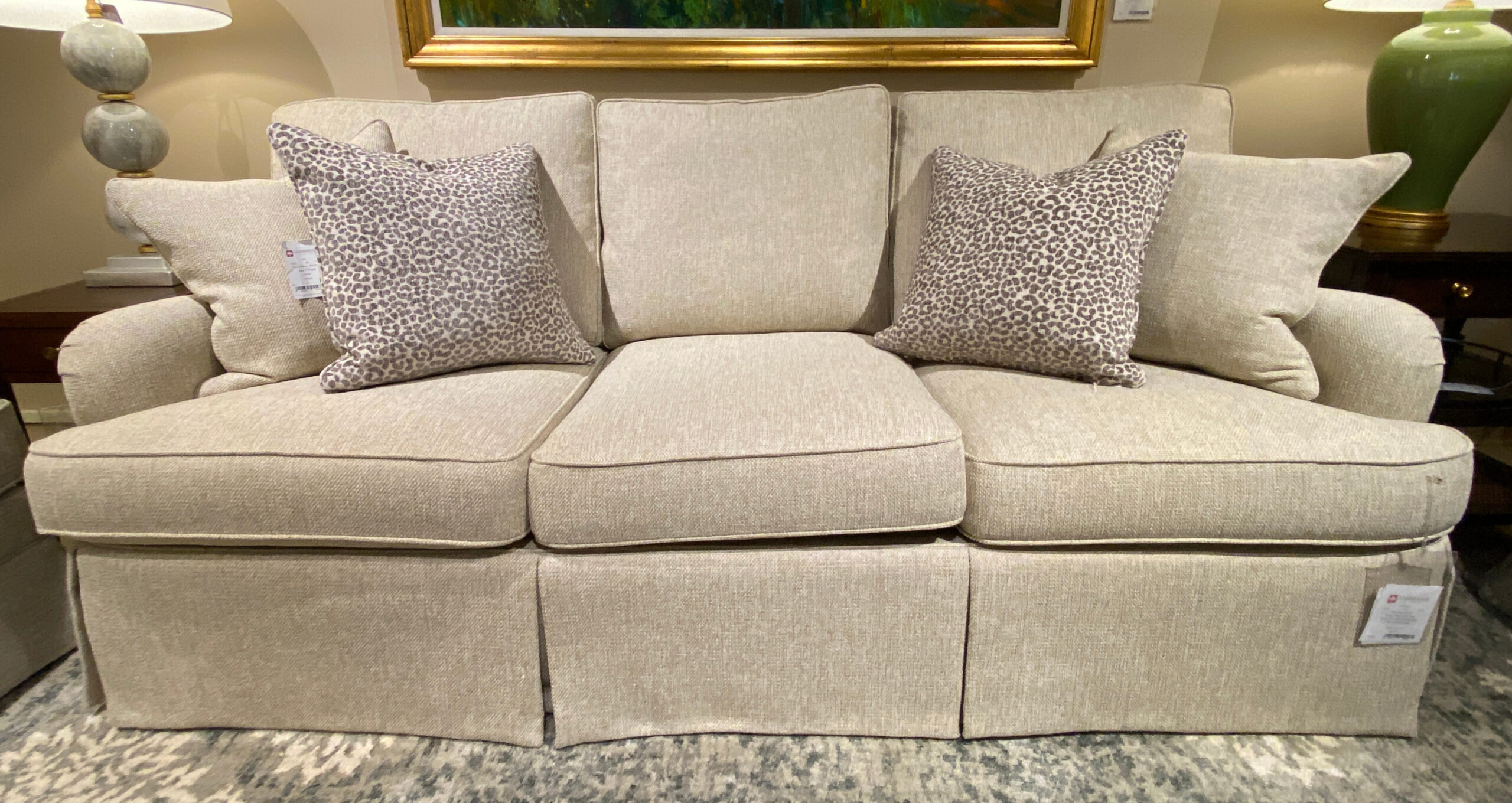 English arm sofa with a dressmaker skirt. Boxed back loose cushions with spring down seats.