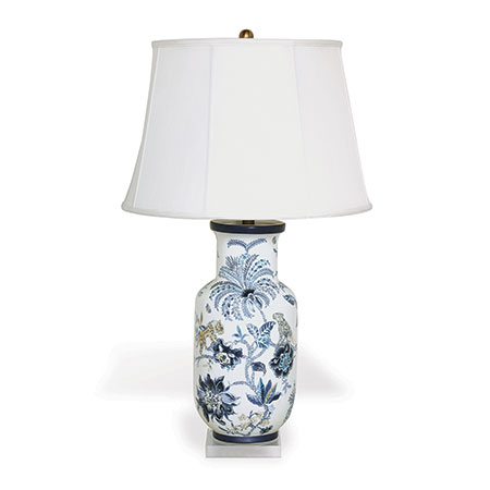 he colorful blue adaptation of a classic Indian chintz resembles linen printed fabric with exotic floral and fauna. Catherine of Braganza, queen of King Charles II of England, brought Portuguese trade routes to the British East India Company, spurring fascination with such Asian goods and fabrics.