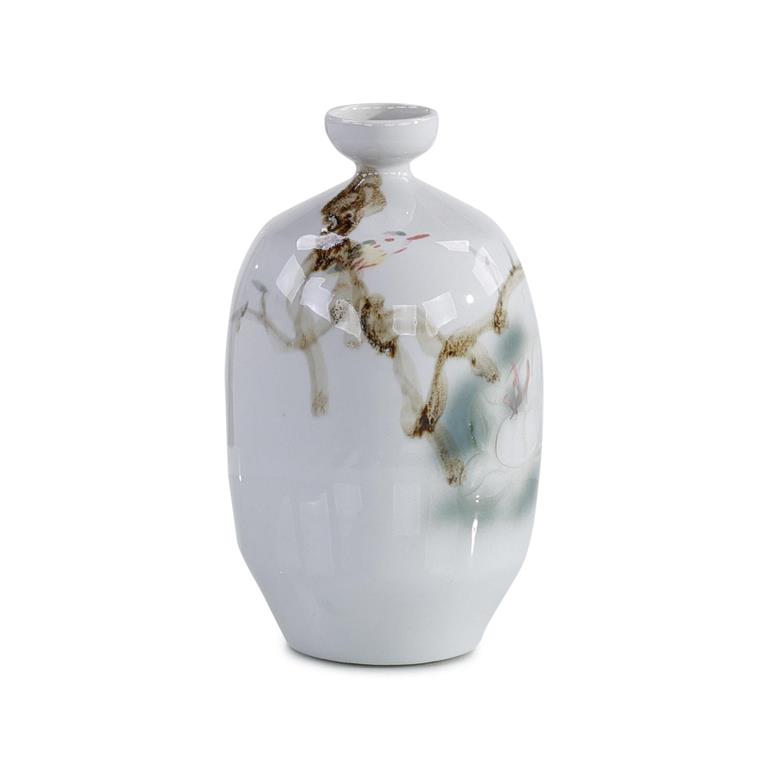 The Painted Grove Vase is an elegant accent piece that celebrates natural beauty. This round vase, crafted from glazed porcelain, features a hand-painted bird resting atop wispy branches.