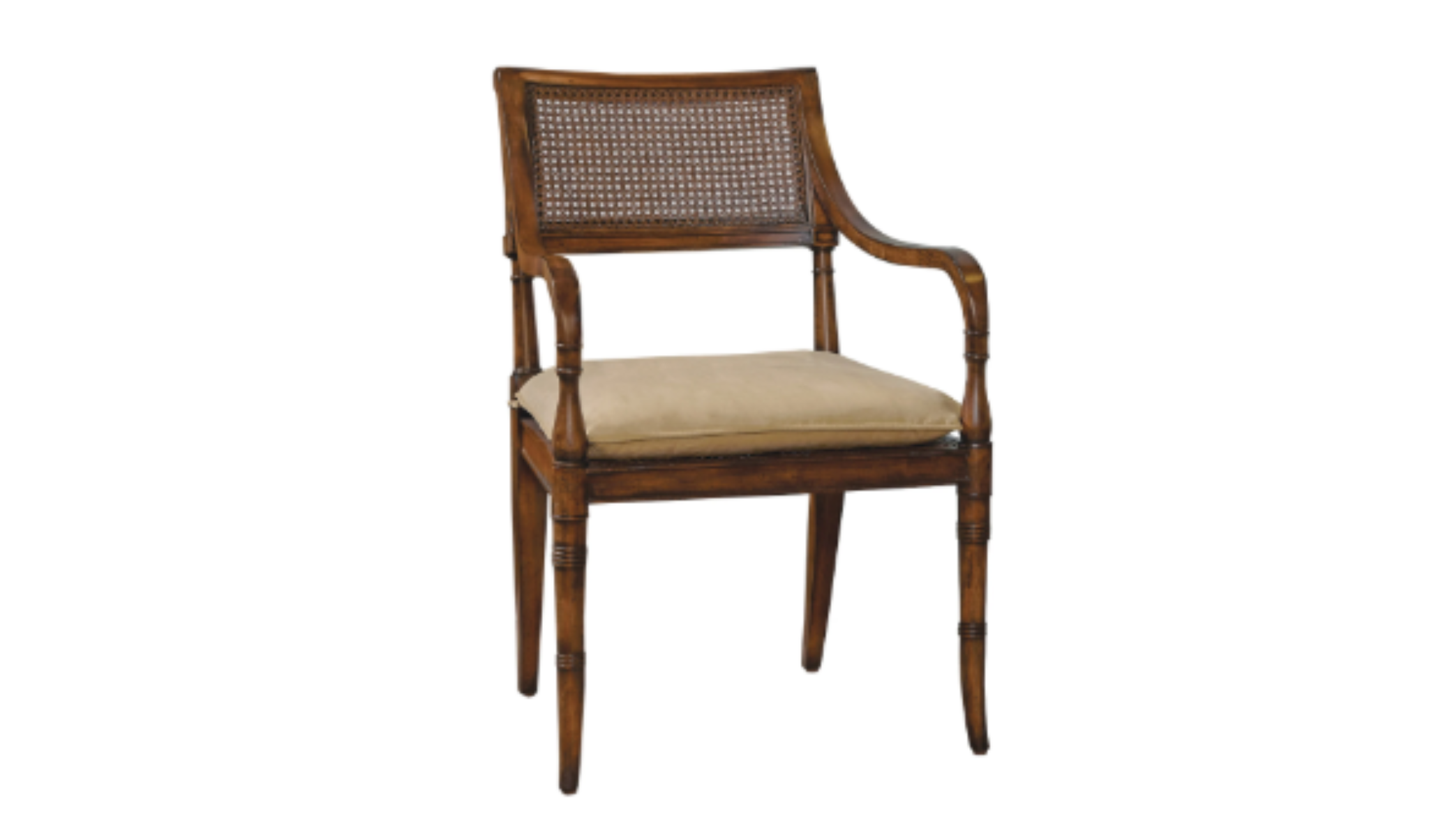 Regency Arm Chair in our Mahogany finish. Subtle silver and gold gild decoration on turnings with caned back.